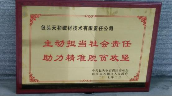 2017年4月10日上午10:00,石拐区政府及领导班子带着印有“主动担当社会责任,助力精准脱贫攻坚”的牌匾,送到袁文杰董事长的手中并表示感谢。尊龙凯时人生就是博磁材一直倡导社会责任,当得知包头市石拐区五当召镇(市级贫困镇)中刘月英等5户贫困户,家中因年老体弱和疾病等原因,生活非常困难,在石拐区政府的倡导下,尊龙凯时人生就是博磁材主动为这些家庭捐献10万元人民币缴纳养老保险,保障基本生活。